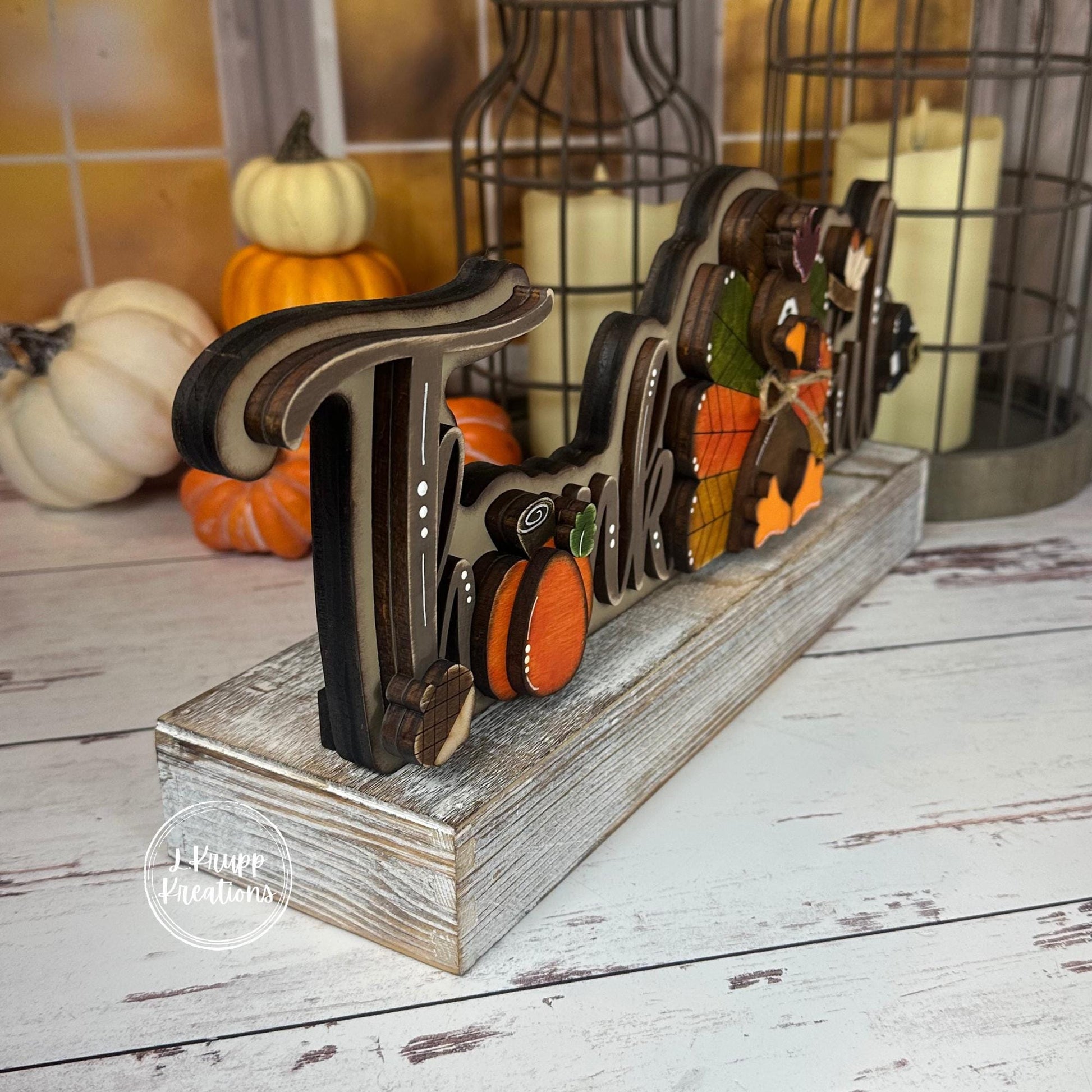 Thankful Thanksgiving Sign Rustic Birch Wood Shelf Sitter with Turkey, Pumpkin & Pilgrim Hat Hand Painted Fall Decor